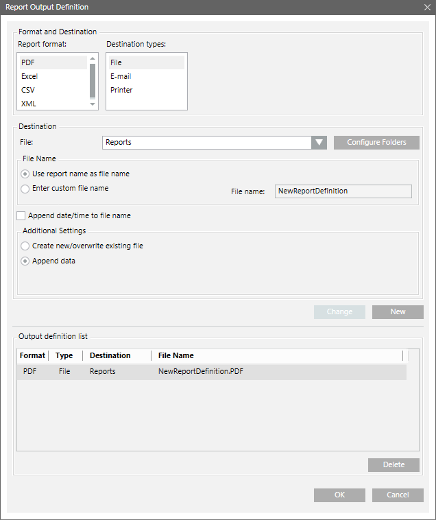 klicken, wird das Dialogfeld Berichtausgabedefinition angezeigt, in dem Sie die Einstellungen für die Berichtausgabe konfigurieren können.
