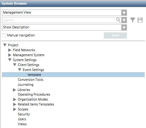 Alarmeinstellungsregeln finden Sie in der Managementsicht des System Browsers unter Projekt > Systemeinstellungen > Client-Einstellungen > Alarmeinstellungen.