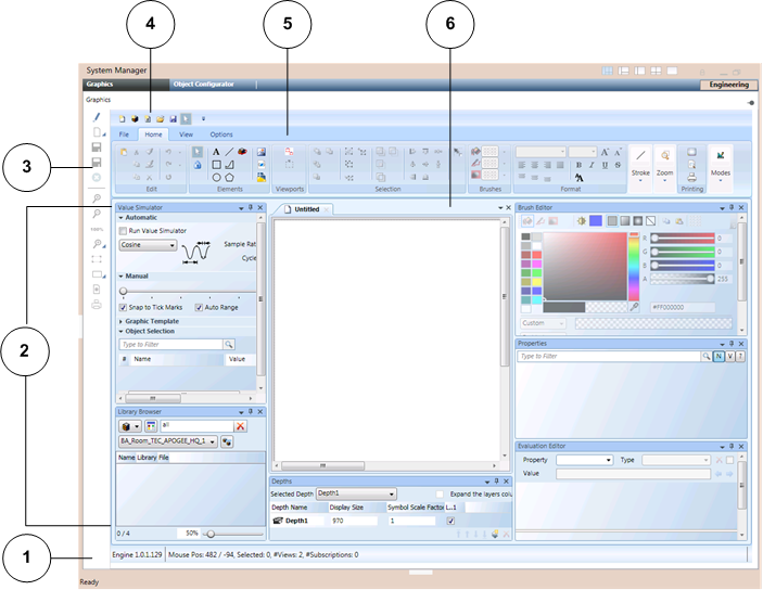 Das Grafikeditor-Fenster enthält mehrere Register, eine Symbolleiste für den Schnellzugriff, eine Statusleiste, mehrere Ansichten zum Anzeigen von Informationen und Ausführen bestimmter Aufgaben sowie einen Arbeitsbereich mit mehreren Zeichenflächen für den Zeichenbereich, in dem Grafiken gezeichnet und bearbeitet werden. Weitere Tools und Komponenten im Grafikeditor sind Kontextmenüs, vertikale und horizontale Bildlaufleisten, Navigationstools und Tastaturkürzel.