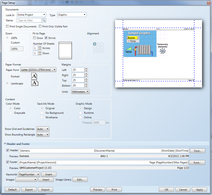 Import | Zu einer vorhandenen Seiteneinrichtungsdatei (.xml) navigieren und diese auswählen, um sie zu öffnen und auf die für den Druck ausgewählten Elemente anzuwenden. | |