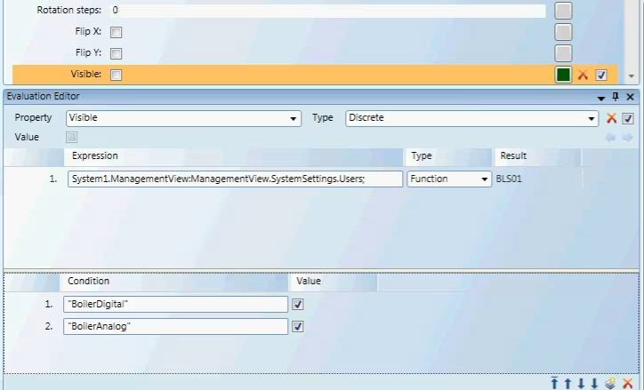 Wenn Ihnen beispielsweise ein Element in einem Symbol vorliegt, das standardmässig unsichtbar ist (die Eigenschaft Sichtbar ist deaktiviert), können Sie eine diskrete Evaluation erstellen, mit dem das Element unter bestimmten Umständen sichtbar wird.