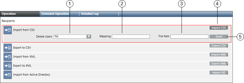 Im Register Import kann der Benutzer Empfänger aus XML- und CSV-Dateien sowie aus einem Verzeichnis mit Empfängern in Active Directory importieren.