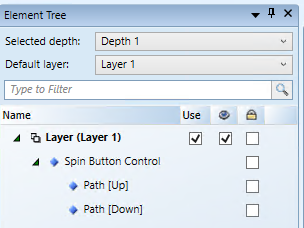 - In der Elementstruktur werden die beiden Schaltflächen AUFWÄRTS und ABWÄRTS als untergeordnete Elemente der Drehelement-Steuerung angezeigt.