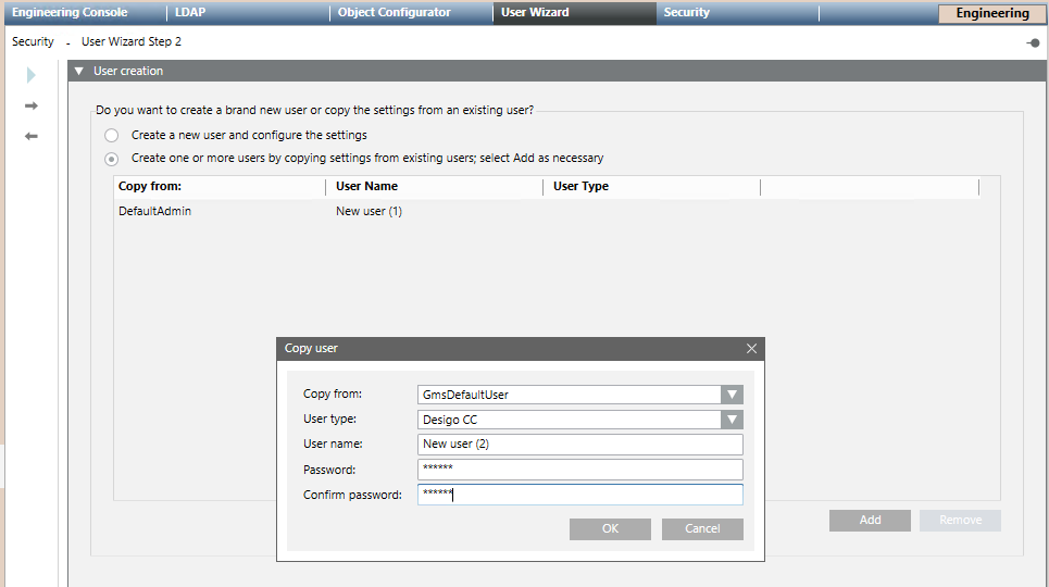 Wenn Sie im vorigen Schritt Desigo CC-Benutzer gewählt haben, geben Sie das Passwort des Benutzers ein und wiederholen Sie es zur Bestätigung.