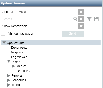 Die Applikationssicht ist vordefiniert und umfasst alle Objekte, die auf applikationszentrischer Ebene zum System gehören, so zum Beispiel Grafiken, Berichte, usw. Grundsätzlich bietet sie eine Darstellung mit Konzentration auf spezielle Systemkomponenten, mit der befugte Techniker üblicherweise bestimmte Elemente konfigurieren, die im Standortprojekt benötigt werden.