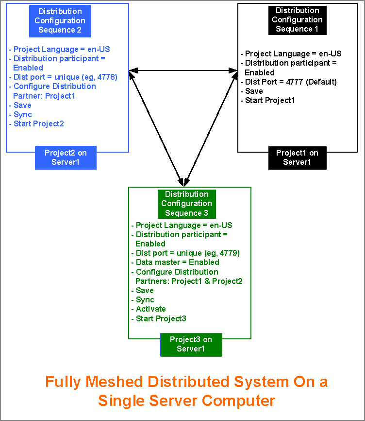 Sie möchten auf einem einzelnen Server ein vollvermaschtes verteiltes System einrichten (segmentierte Konfiguration). Hierzu müssen Sie die Projekte in der Verteilung auf demselben Server konfigurieren.