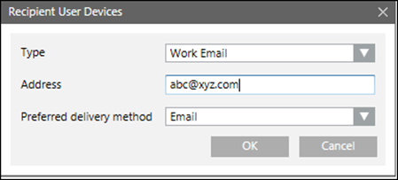 Wählen Sie im Dialogfeld Empfängergeräte aus der Dropdown-Liste Typ als Empfängergerät für den jeweiligen Benutzer die Option Persönliche E-Mail oder Arbeits-E-Mail.