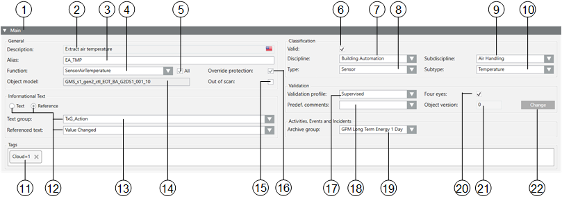 Angaben zu Disziplin, Subdisziplin, Typ und Subtyp haben in Desigo CC einen direkten Einfluss auf Alarmweiterleitung, Scopes und Suchkriterien.