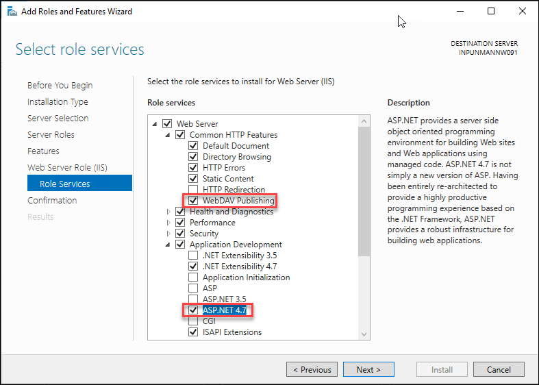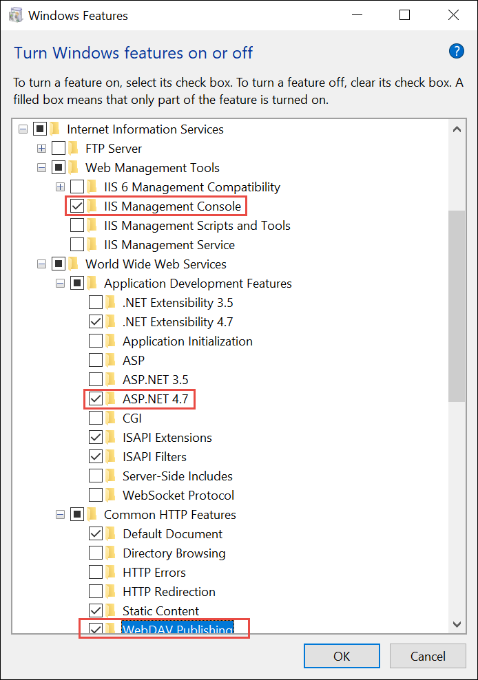 - Expand Internet Information Services > World Wide Web Services > Application Development Features, and select the ASP.NET 4.7 check box (this automatically checks other relevant boxes). For Windows 10 version 2004 and Windows 11, select the ASP.NET 4.8 check box.