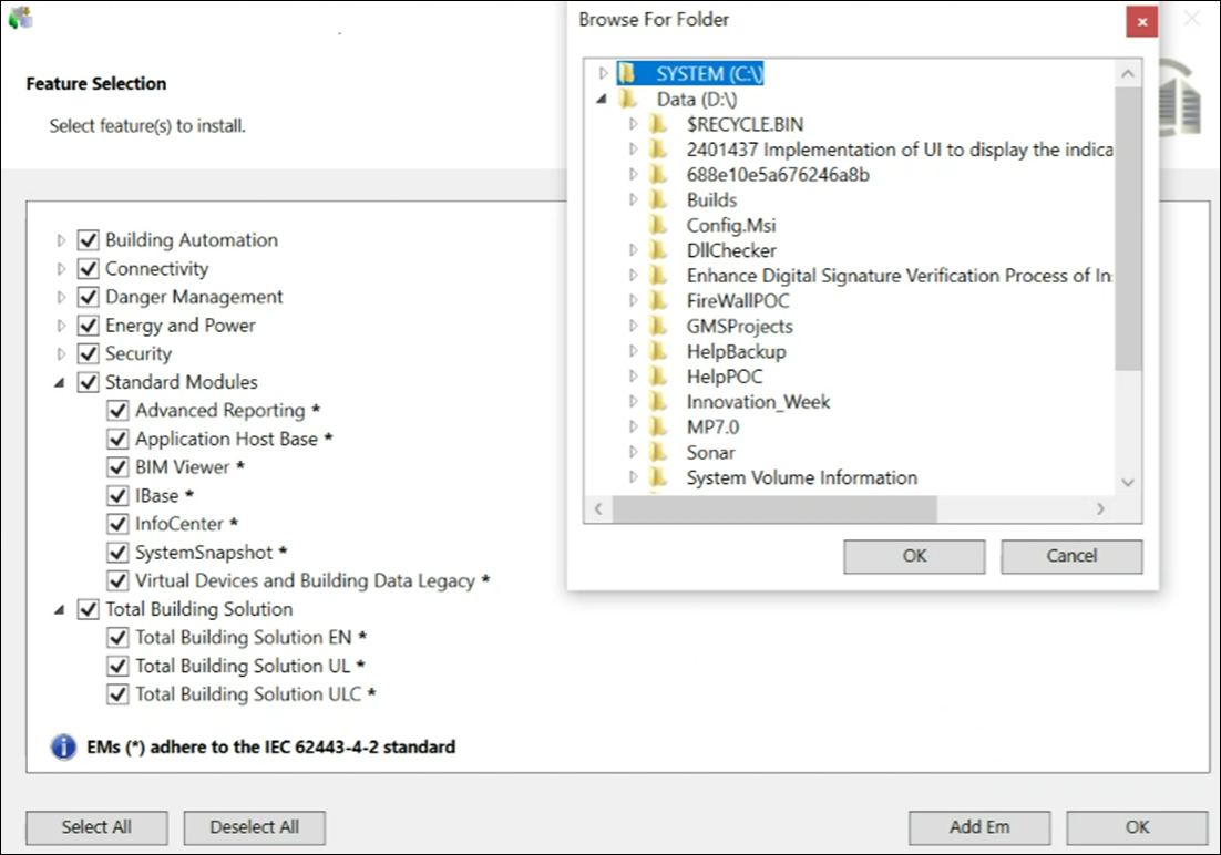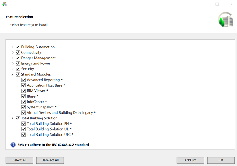 If all mandatory and non-mandatory extensions are IEC certified, a message "Platform and EMs (*) adhere to the IEC 62443-4-2 standard" displays in the Feature Selection dialog box.