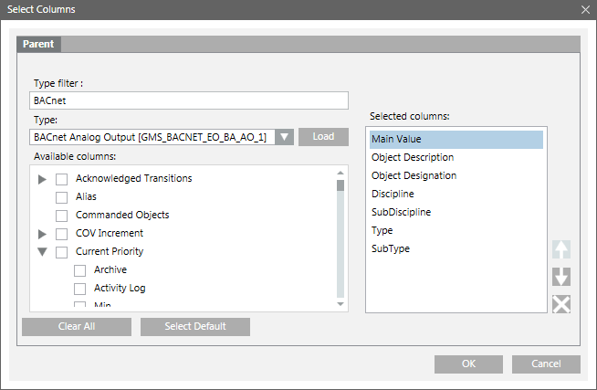 c. Click the Load button. All the common columns and columns specific to the selected object display in the Available columns list.