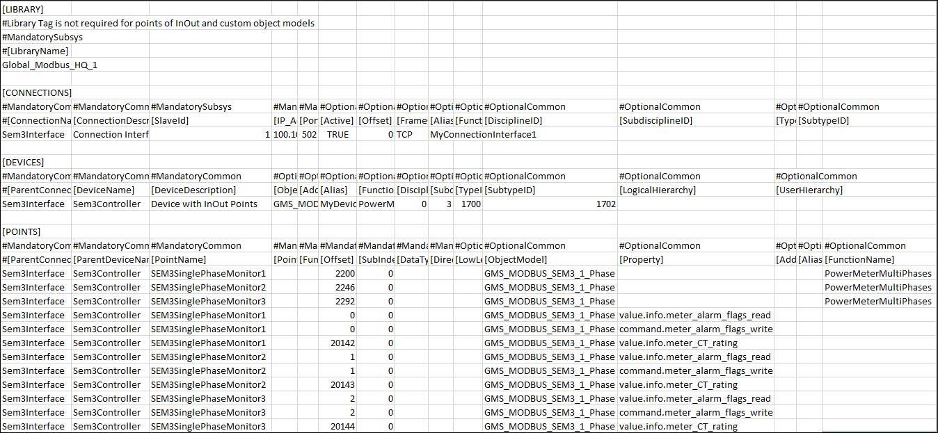 Additionally, you must also specify all the relevant details in a CSV file. The file has to be carefully configured to ensure that the SEM3 devices are integrated with the management platform and each embedded micro metering module displays below the SEM3 controller in the System Browser. (See Integrating SEM3 devices with the Management Platform from the Additional Modbus Procedures.)