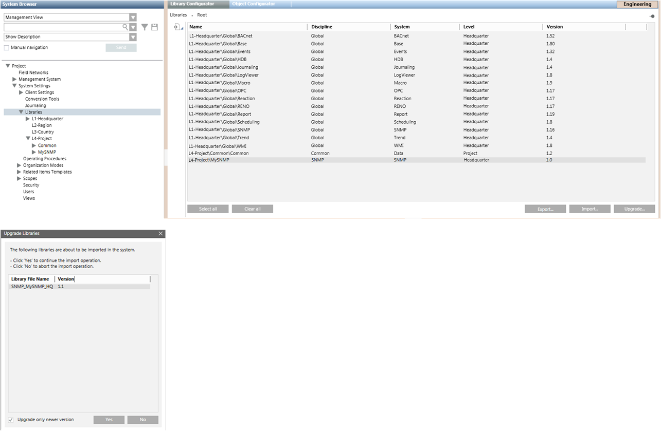 9. When the Upgrade Libraries dialog box displays, click Yes to upgrade the SNMP library.