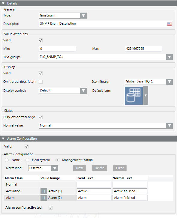 • Enable the Alarm Configuration and select the Management Station option. Then define the behavior of all the alarms belonging to this DPE. For example, when the SNMP point has the value Active (read from Text Group and equal to 1), the management station will trigger an Activation event; when the SNMP point has the value Alarm (read from Text Group and equal to 2), the management station will trigger an Alarm event, and so on.