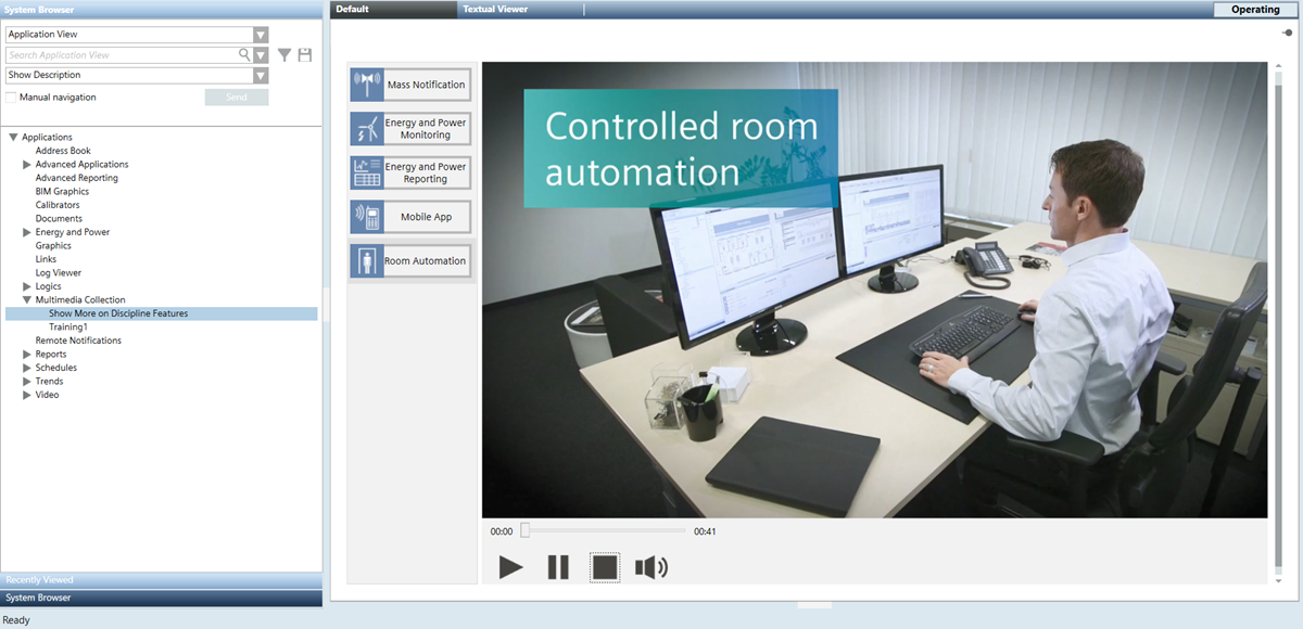 When you select a multimedia collection (for example, Show More on Discipline Features) in System Browser, the Default tab displays a welcome page with a button for each topic configured (in this case, discipline buttons such as: Mass Notification, Energy and Power Reporting, Room Automation, and the mobile app). Clicking one of the buttons results in the corresponding media file being played on the right while the buttons stay available on the left. The typical player buttons are also available to start, pause, stop, and mute the media file.