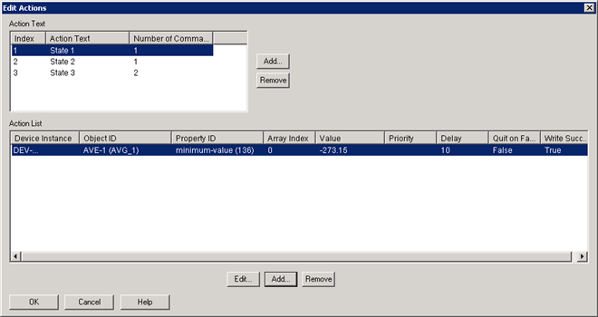 From the system tree, expand your BACnet device. From the Commands folder, select an object. In the Property Name column, right-click action and select Write Property. From the Edit Actions dialog box, click the Edit button.
