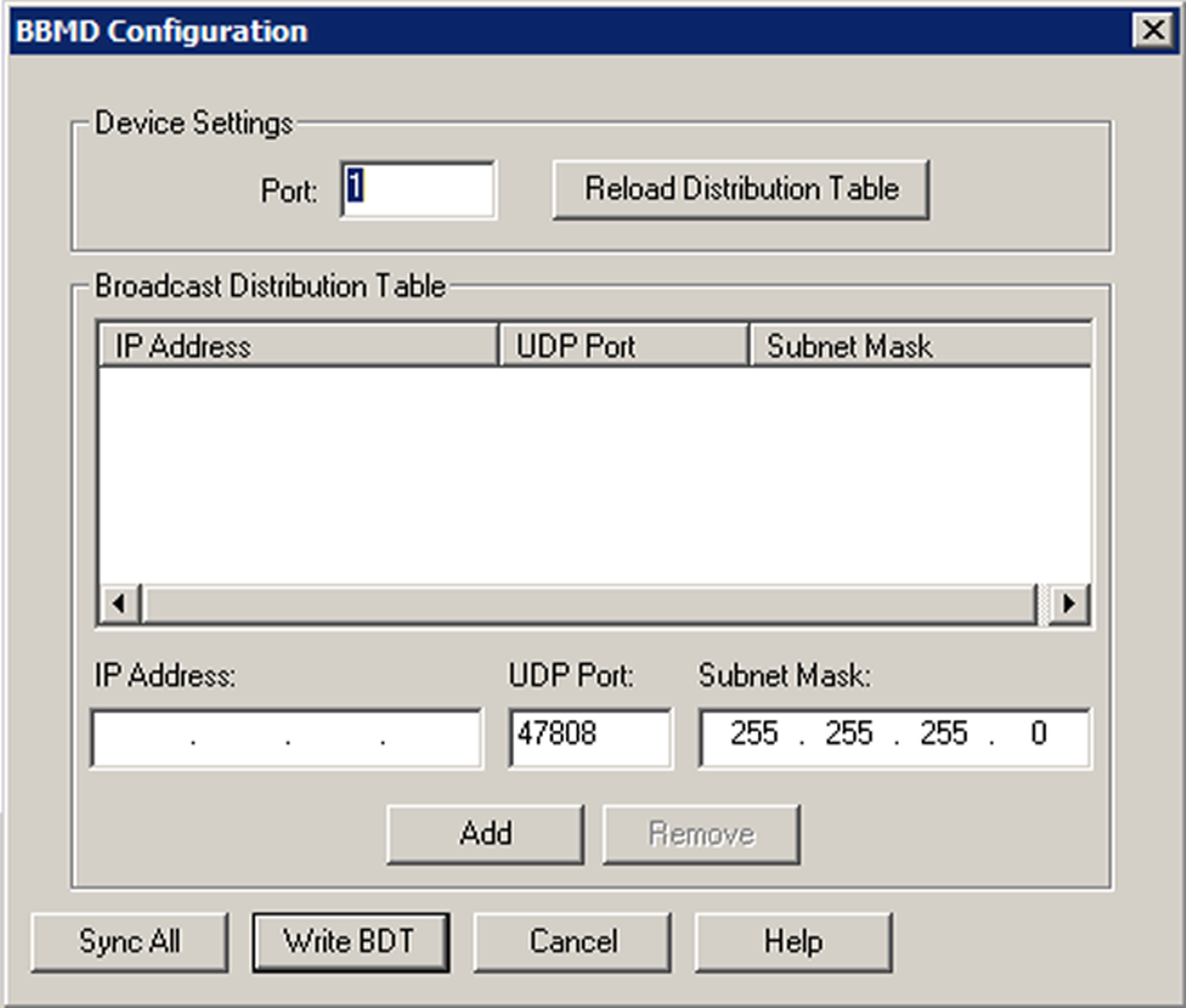 IP Address | Enter the IP Address for a device on the network that you want to add to the BBMD table. Adding an entry with the same IP address will overwrite any existing address with that IP Address. Double-clicking on an item in the list will populate the IP Address, UDP Port, and Subnet Mask so that entry can be edited. |