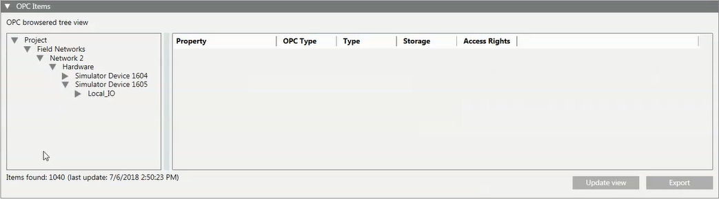 - (Optional) In the OPC Items expander, click Update view to refresh the Desigo CC OPC DA server configuration data.