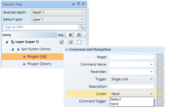 cursor to display instead of the Default cursor when the mouse cursor is over the selectable element, you must configure the cursor on the sub-elements (child) of the command control. This applies to the following command controls: