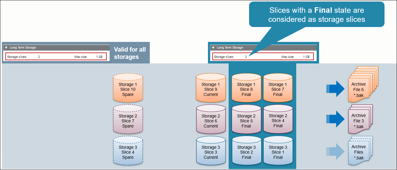 A project can have several archive groups. You can define settings for each archive group separately, whether the data is written to the Short Term Storage (STS) or the Long Term Storage (LTS) (see Configuring History Database in System Browser). Each LTS can have one or more LTS slices. You cannot edit or delete data in the LTS. You can only add data.