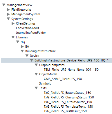 The Riello UPS extension installs the Desigo CC library BuildingInfrastructure_Device_Riello_UPS_150_HQ_1 that is available at the following path: Libraries > L1-Headquarter > Building Infrastructure > Device.