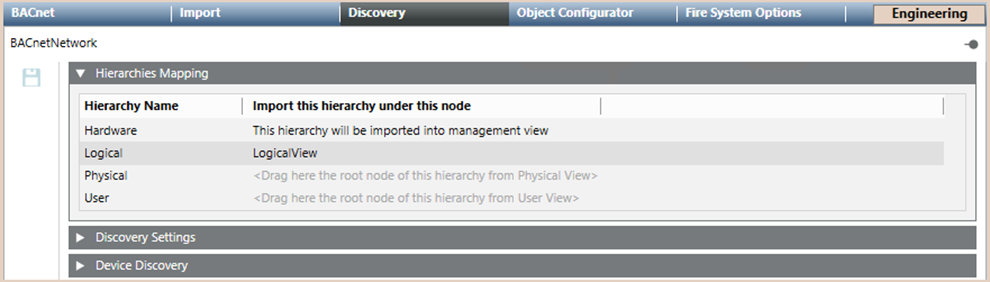 NOTE: The hierarchies mapping configuration cannot be modified after the import of the configuration file. For general background information about the Desigo CC import, see Field Data Import. - Import the device using the BACnet Auto Discovery function. For instructions, in 3rd Party BACnet Integration, see Workflow Online Engineering.