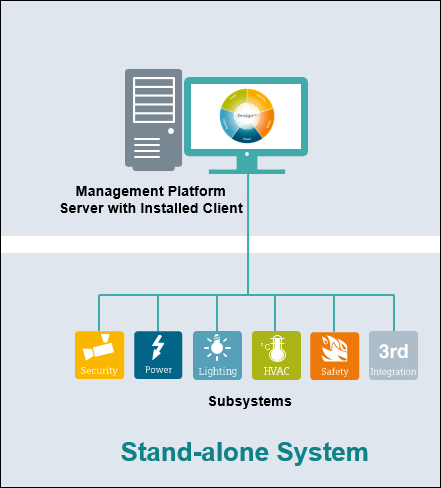 This is a simple setup where no IT firewalls need to be opened for communication. A stand-alone system is secure in regards to attacks from the outside. However, installation guidelines for closing outside communication by firewall settings, virus scanner, and backup must be followed to secure the system.