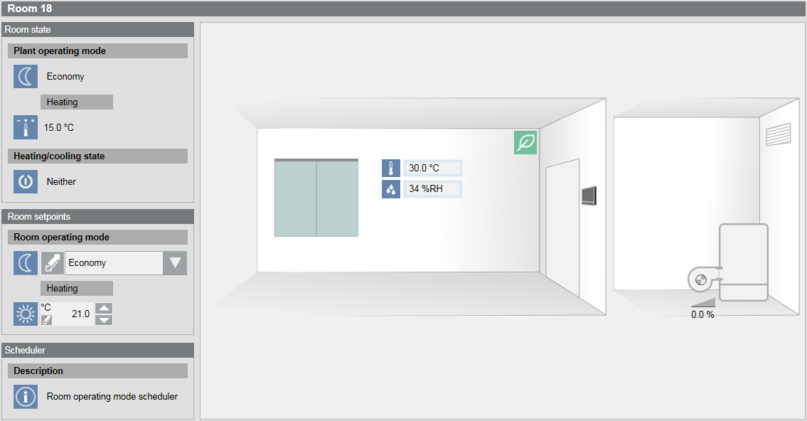 - In the System Browser or floor plan view, select the room to operate. The graphical view is based on the applied configuration.
