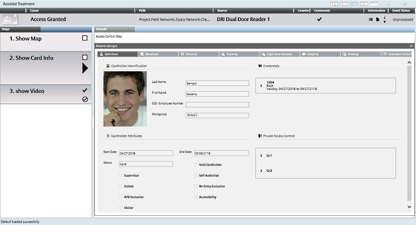 Assisted Treatment procedures may include a cardholder information step, that provides details pertinent to the SiPass event that is being handled. Specifically, depending on the type of SiPass event, the Card Info step will show one of the following: