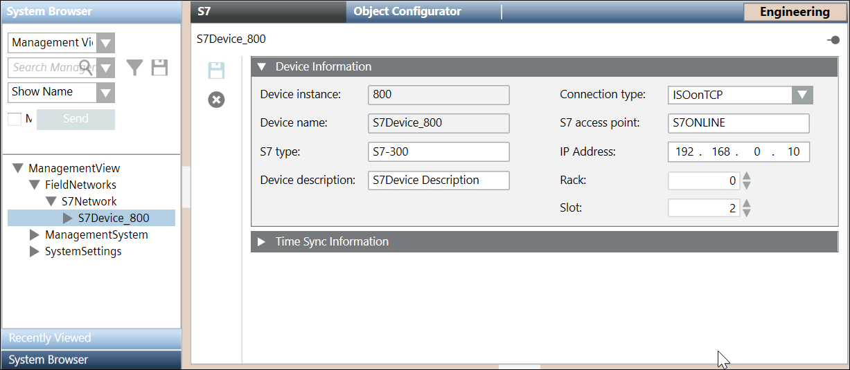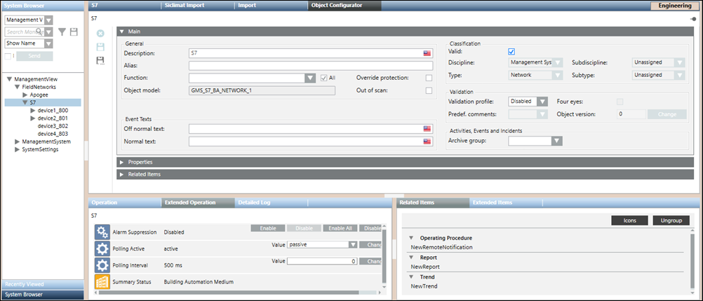 The S7 network workspace allows you to configure the network settings such as associating the Standard S7 driver to the network and saving the association. The properties associated with the selected network display in the Operation tab or Extended Operation tab. You can also change the value of the poll interval. By default, this value is set to 0 ms. In order to delete the network, you must click Delete that displays in the toolbar in the Object Configurator tab.