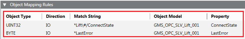 - In line with the library discovery rules, the OPC items highlighted in the figure above are mapped to the different properties of the node “Lift1” of type GMS_OPC_SLV_Lift_001 (see the