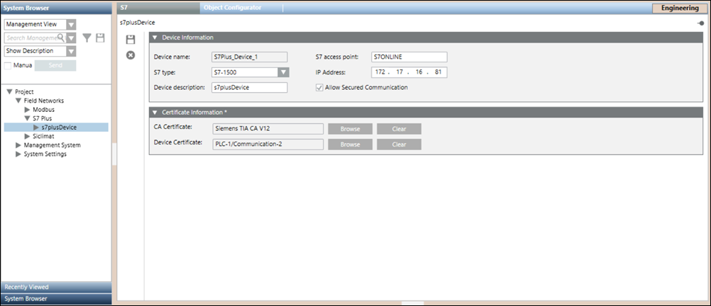 Allow Secured Communication | Allows you to secure communication between the S7 PLUS device and Desigo CC using certificates. If selected, the Certificate Information expander displays with the CA Certificate and Device Certificate fields. |