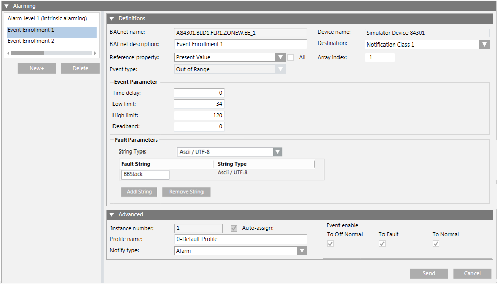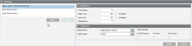 New+ | A BACnet object only has one intrinsic alarm. Clicking the New button lets you create a new event enrollment object. Since you cannot delete an intrinsic alarm, the Delete button is unavailable. |
