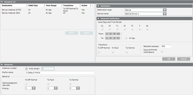 Recipient List | This section defines the notification class object’s recipient list (the list of devices or management stations receiving object alarms). Click New or select an existing destination to display the Destination and Advanced Notification sections. Use these sections to specify a device. To remove a destination from the list, select the destination and click Delete. |