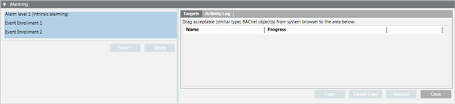 This section displays when you click the Copy All button on the Application toolbar. It allows you to copy the event enrollment objects and the intrinsic alarm properties associated with a BACnet object (source object) to one or more BACnet objects (target objects). This process creates new event enrollment objects for each target object, and overwrites the target object’s intrinsic alarm properties with the properties of the selected object.