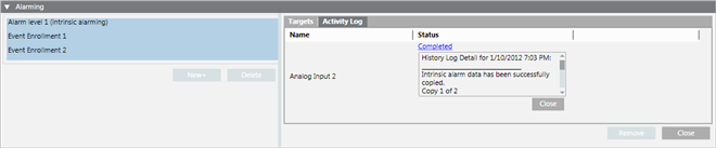 - Copy Alarms: Use this feature to copy the alarms from a selected (source) object to one or more target objects. This process creates new event enrollment objects for each target object, and overwrites the target object’s intrinsic alarm properties with the properties of the selected object.