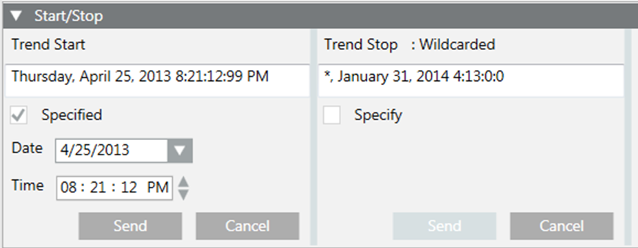 Specify/Specified | If wildcards are present in the start or stop times, the Specify box is unchecked and the Date and Time fields are hidden. When you check Specify, its name changes to Specified and the Date and Time fields display. The default Trend Start time is the current date and time, and the default Trend Stop time is 24 hours from the current date and time. NOTE: Unchecking the Specified box replaces the date and time with all wildcards (*). |