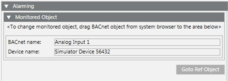 The fields that display in the Alarming section can vary depending on what you select in System Manager; a point that is referenced by one or more event enrollment objects, or an object that is an event enrollment object.