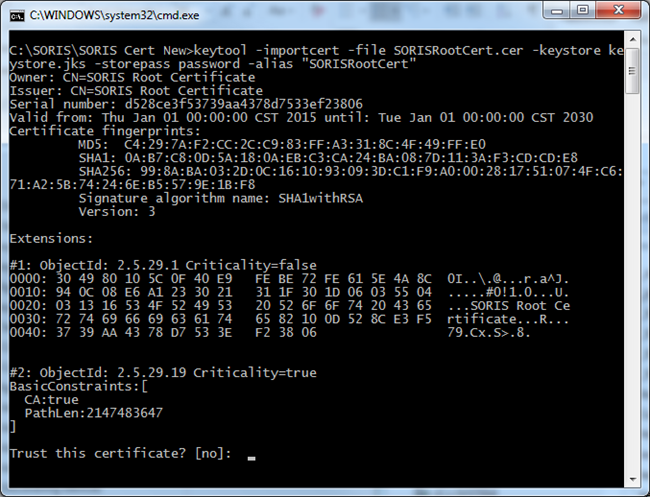 keytool -importcert -file SORISClientCert.cer -keystore keystore.jks -storepass <password> -alias "SORISClientCert"