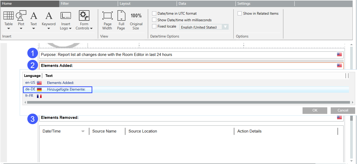 - Enter a localized text (1, 2 and 3) for the standard report.