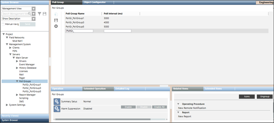 Poll Groups allow you to assign different polling intervals to individual data points. They also enable values to be polled more or less frequently. For example, by reducing the polling interval for values that do not need to be polled frequently, network traffic can be reduced.
