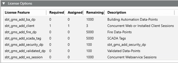 For license features covering software functionality, one assigned copy is sufficient to enable that functionality for all Desigo CC clients. For example, Assigned=1 for sbt_gms_ext_sm enables System Manager for all clients.