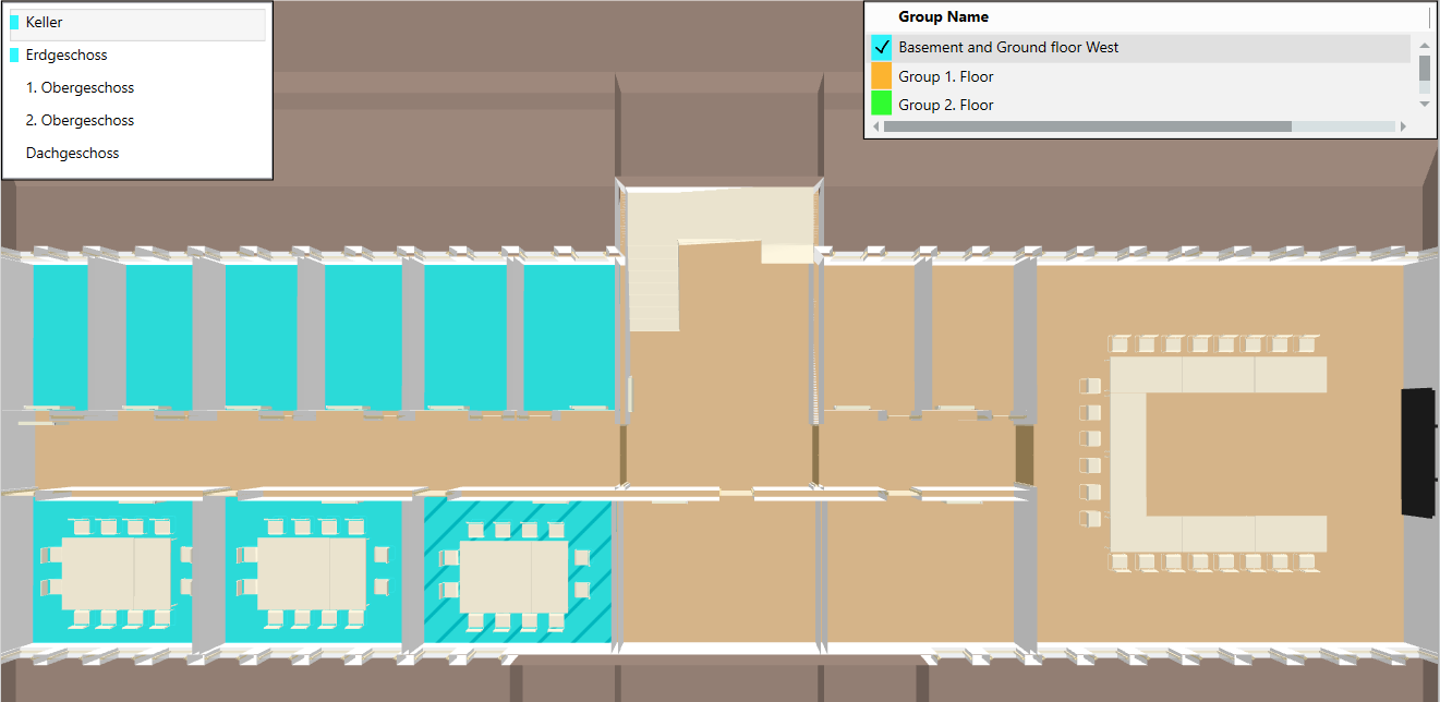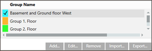 3. Click Show/hide floor list window . When shown, the floor list highlights groups in color that extend beyond one floor.