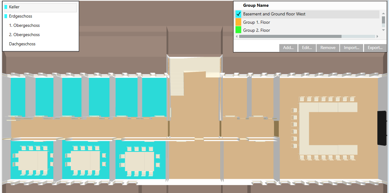 2. The group is highlighted in the room grouping window. All groups are highlighted when a room is assigned to more than one group. The associated groups are listed at the top.