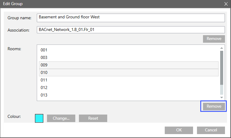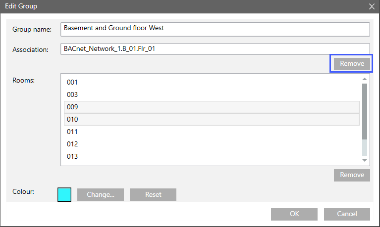 1. In the room grouping window, select the group to remove.