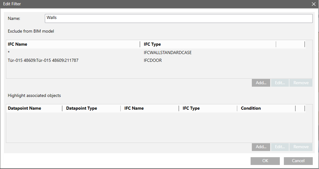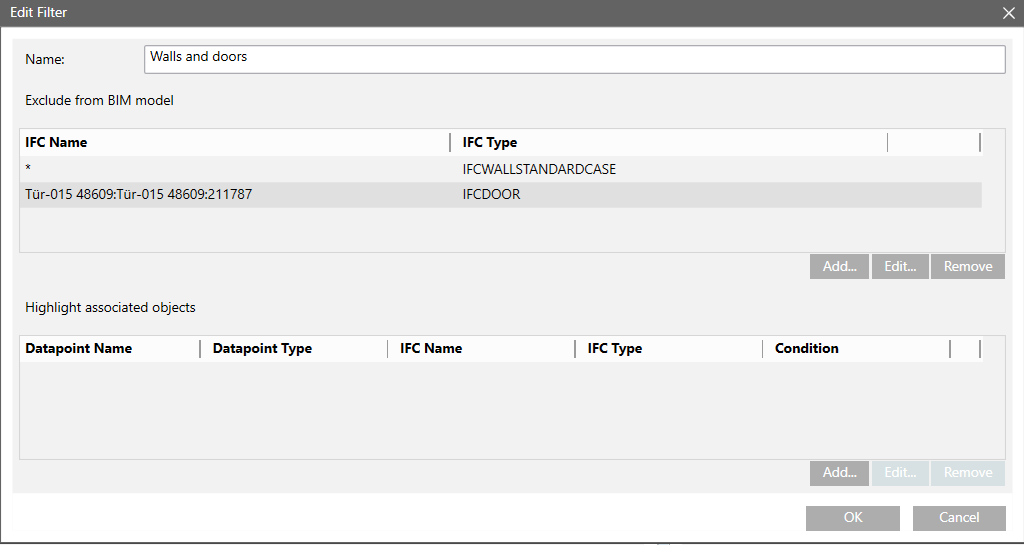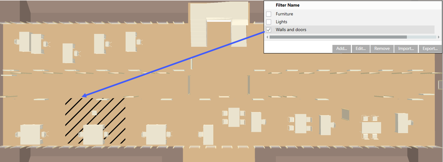 Scenario: All walls and doors are hidden with just one filter. Use the existing Walls filter as the starting point. The BIM object model for doors in unknown and must be first found.