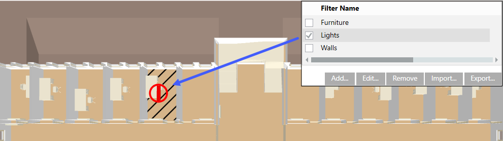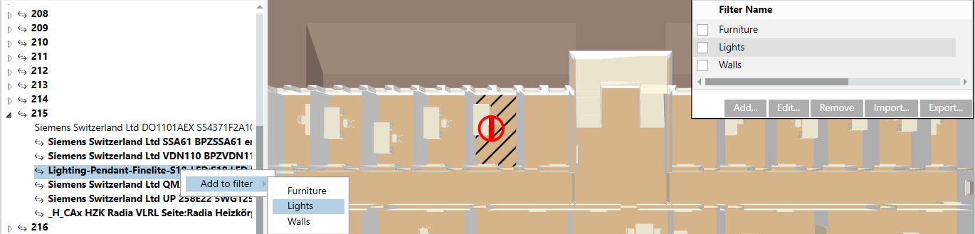 Scenario: After finding the BIM object model for lighting objects, you can emphasize all lighting objects associated with this BIM object model based on the lighting object.