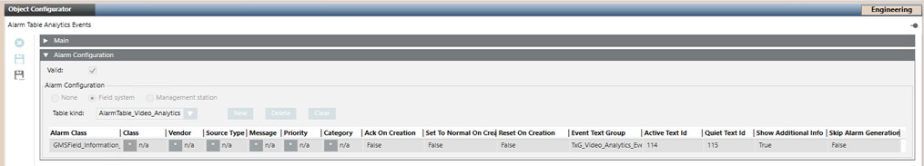 - The content of the video alarm table for VMS analytic events displays. By default it contains only one catch-all row that sets how all VMS analytic events are reported in Desigo CC.