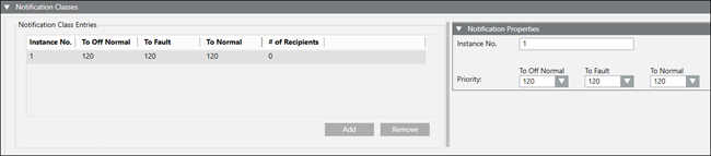 Notification Class Entries Table | Add: Adds an entry in the Notification Class Entries table. Remove: Removes a selected entry in the Notification Class Entries table. Instance No.: The number entered in the Instance No. field. Priorities: The priorities selected in the Priority fields. # of Recipients: The number of devices registered to receive alarms and alarm acknowledgements. |