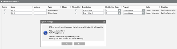 Device use subscriptions | When selected, BACnet Server creates COV subscriptions for all mappings in the list. |